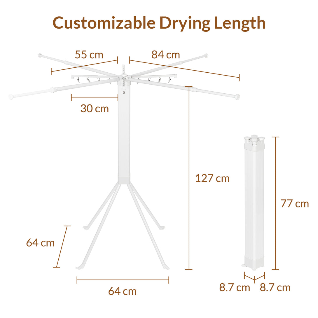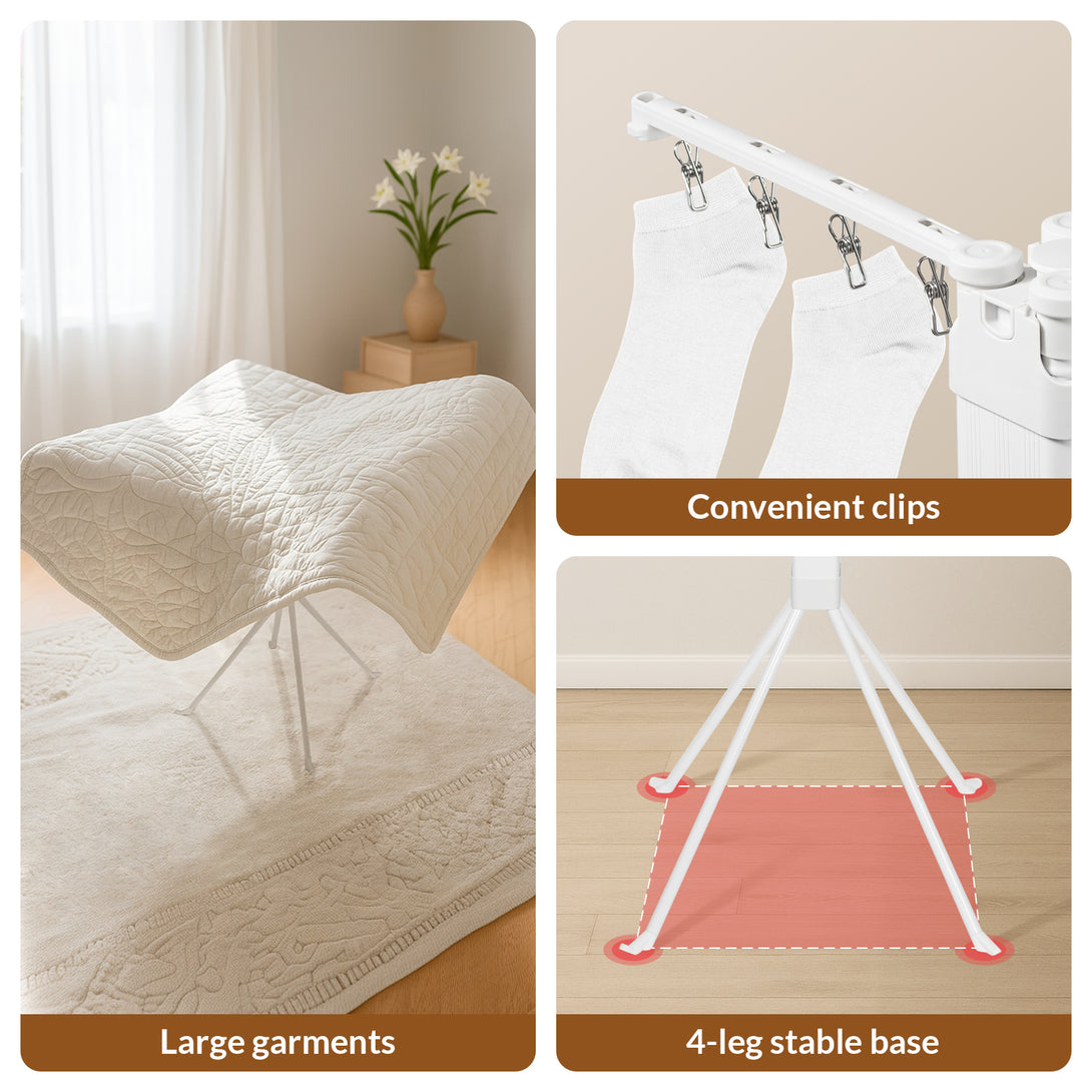 Pinces pratiques : 16 pinces intégrées sur 4 tiges courtes pour suspendre chaussettes, serviettes et textiles délicats.