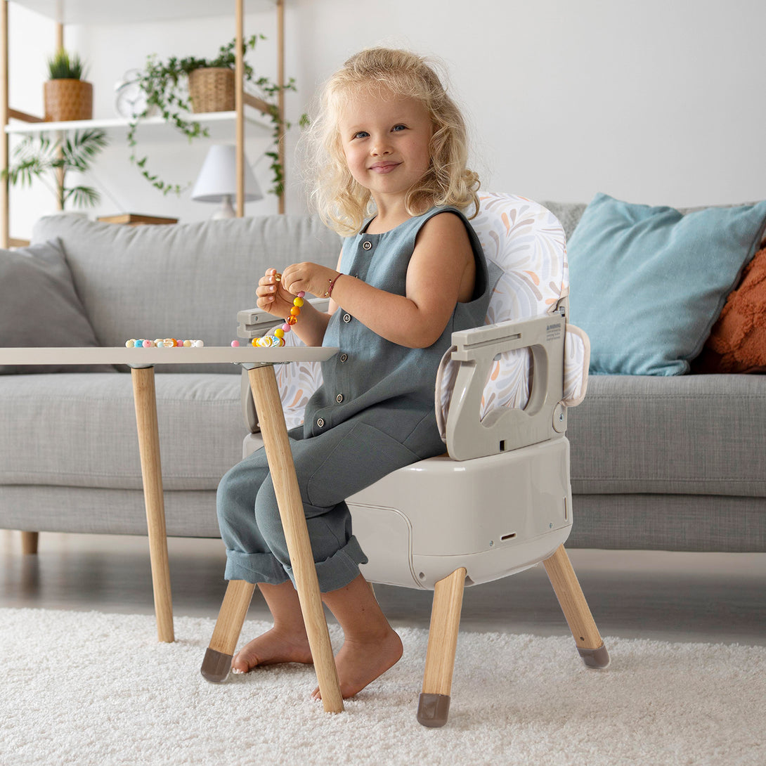 A: Er kann als Hochstuhl, Sitzerhöhung oder kleiner Stuhl verwendet werden und bietet so eine große Vielseitigkeit, um das Kind in verschiedenen Entwicklungsstufen zu begleiten.