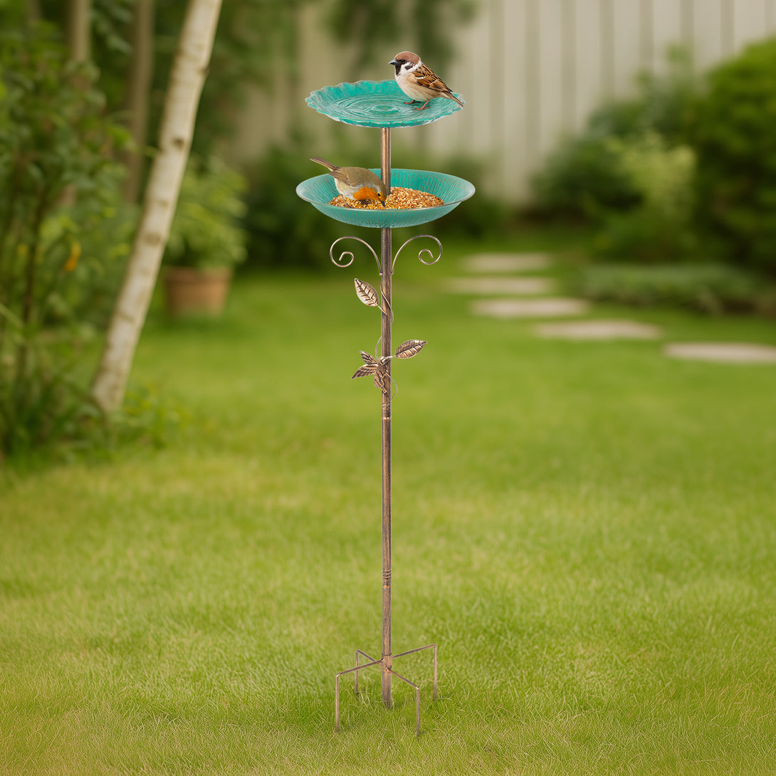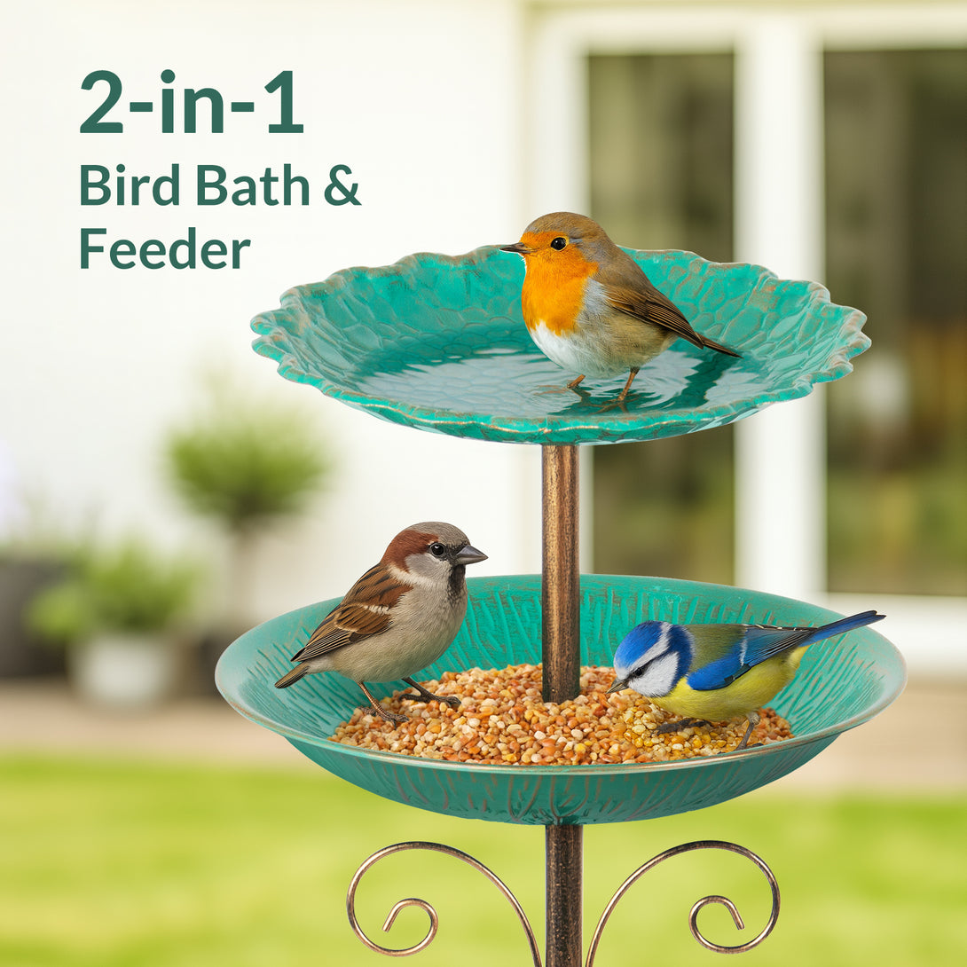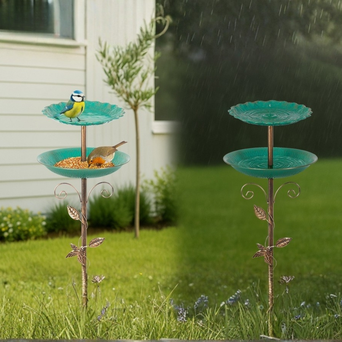 A: Sein 2-in-1-Design mit zwei übereinanderliegenden Schalen dient sowohl als erfrischendes Bad als auch als Futterspender, bietet Wildvögeln gleichzeitig Wasser und Nahrung.