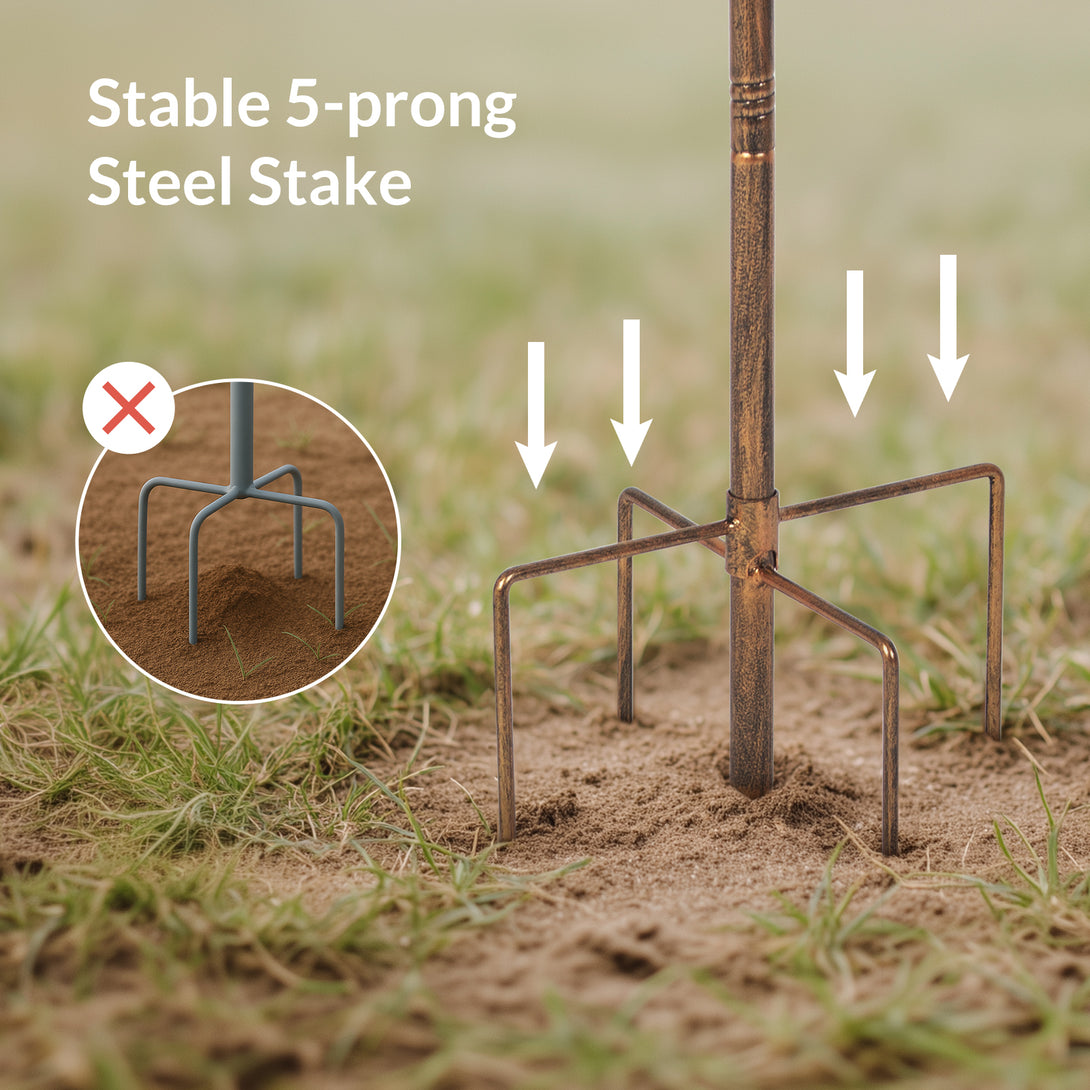 Stabile 5-Krallen-Basis: Verstärkter Pfahl mit fünf Spitzen, der fest im Boden oder Rasen verankert wird, verhindert Umkippen auch bei starkem Wind.