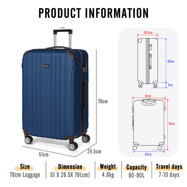 Large Capacity: 78x51x28.5cm, ideal for 7 to 10 days of travel.