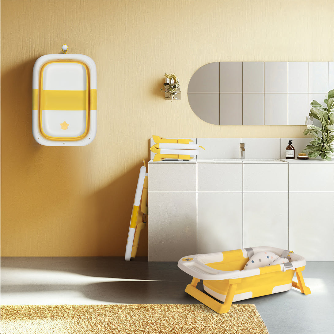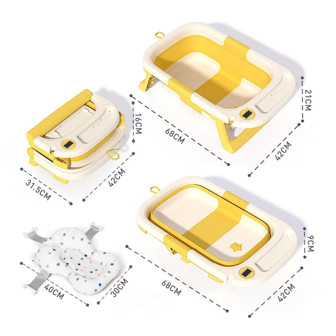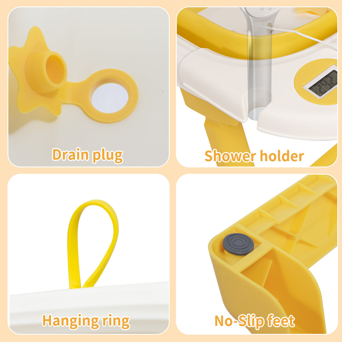 R: La bañera incluye un termómetro visible para ayudar a los padres a ajustar la temperatura del agua, un cojín suave para el soporte de la cabeza y el cuello, y un soporte para la ducha. También tiene un orificio de drenaje con un tapón de goma para un fácil drenaje del agua.