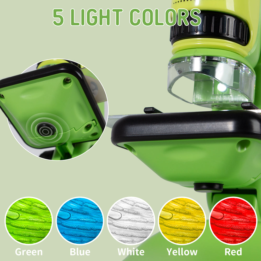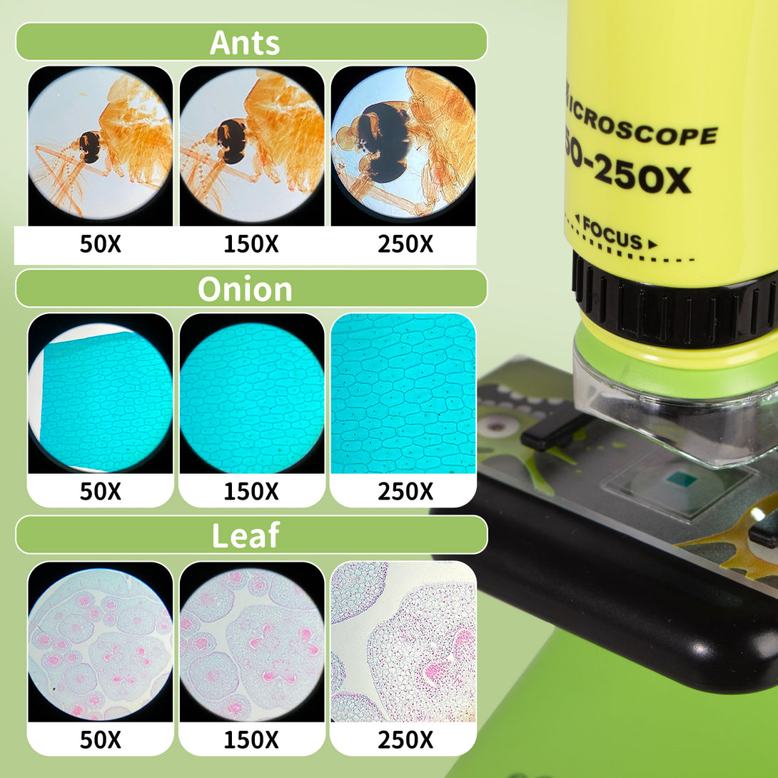 A: El microscopio tiene una base desmontable con opciones de mesa y de mano, permitiendo la observación de especímenes, la observación a mano al aire libre y la visualización de varios objetos con una longitud focal ajustable. Anima a los niños a explorar el mundo microscópico en profundidad.