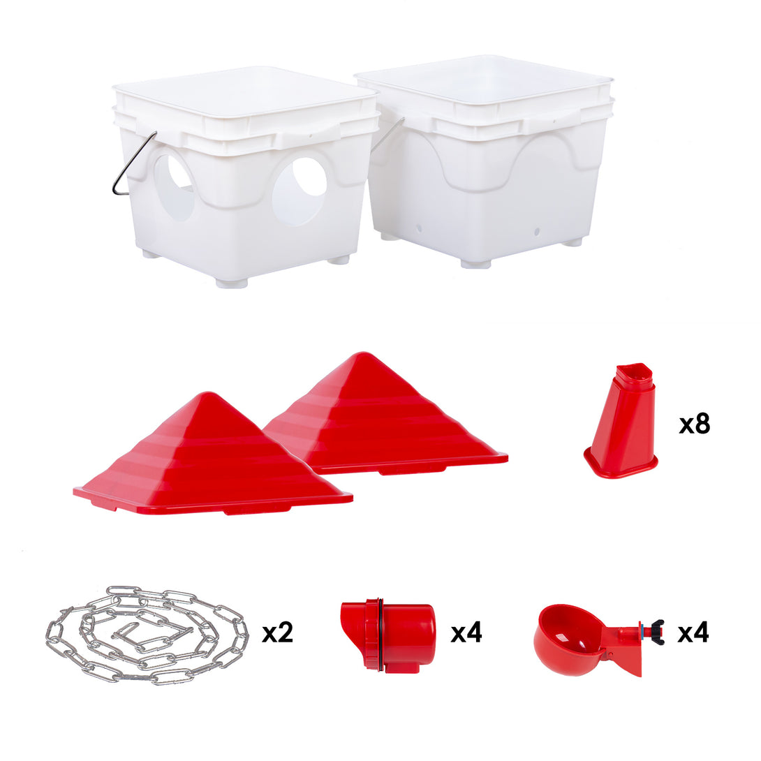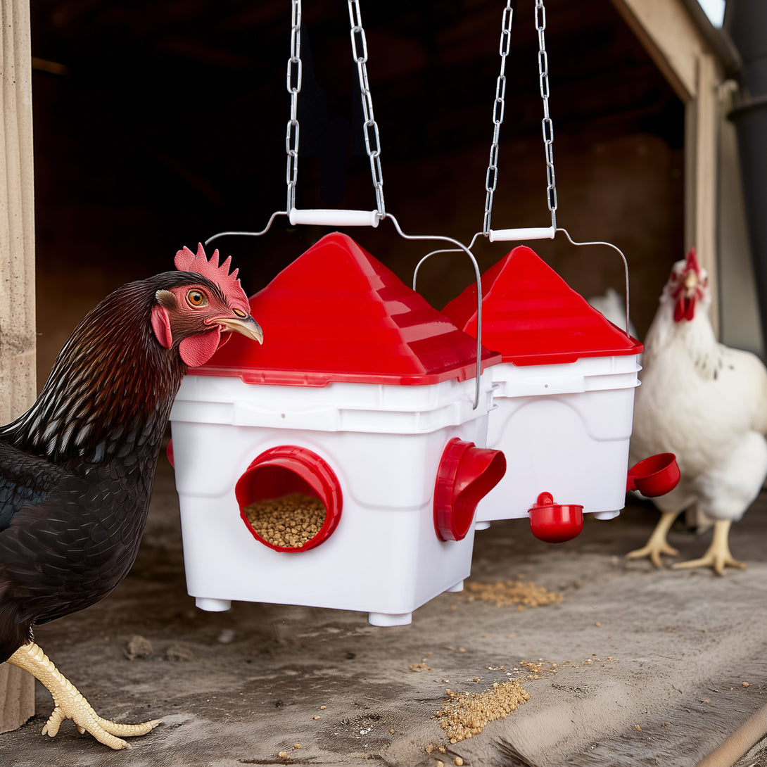 Conjunto de comedero y bebedero suspendido: Puede ser suspendido o montado en la pared para evitar la entrada de barro y cama.