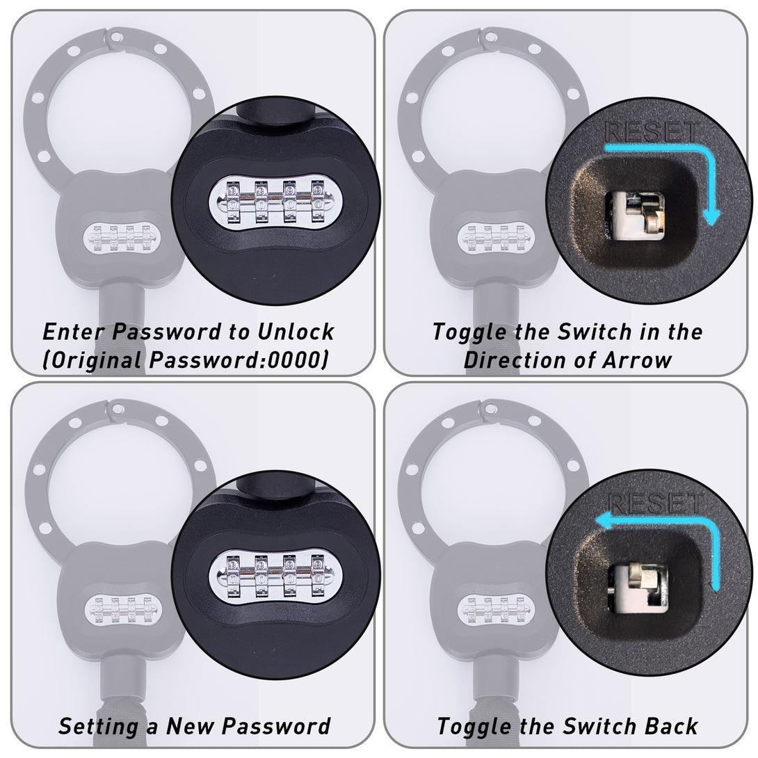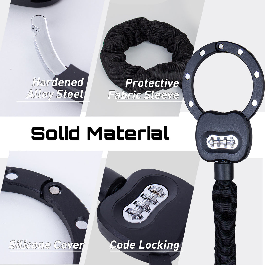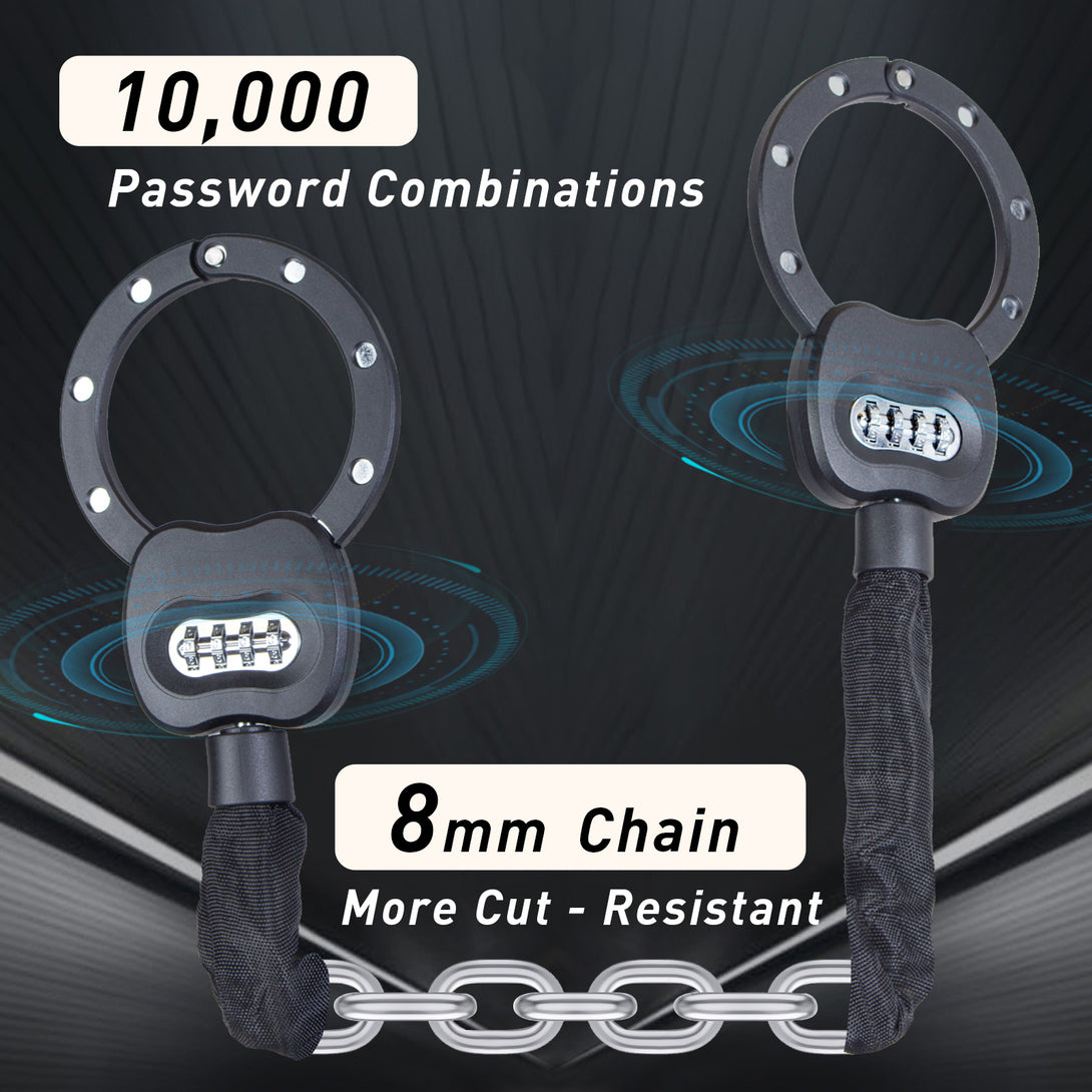 Seguridad mejorada: 10.000 combinaciones y cadena de acero endurecido de 8 mm – resistente a cortes, óxido e impactos.