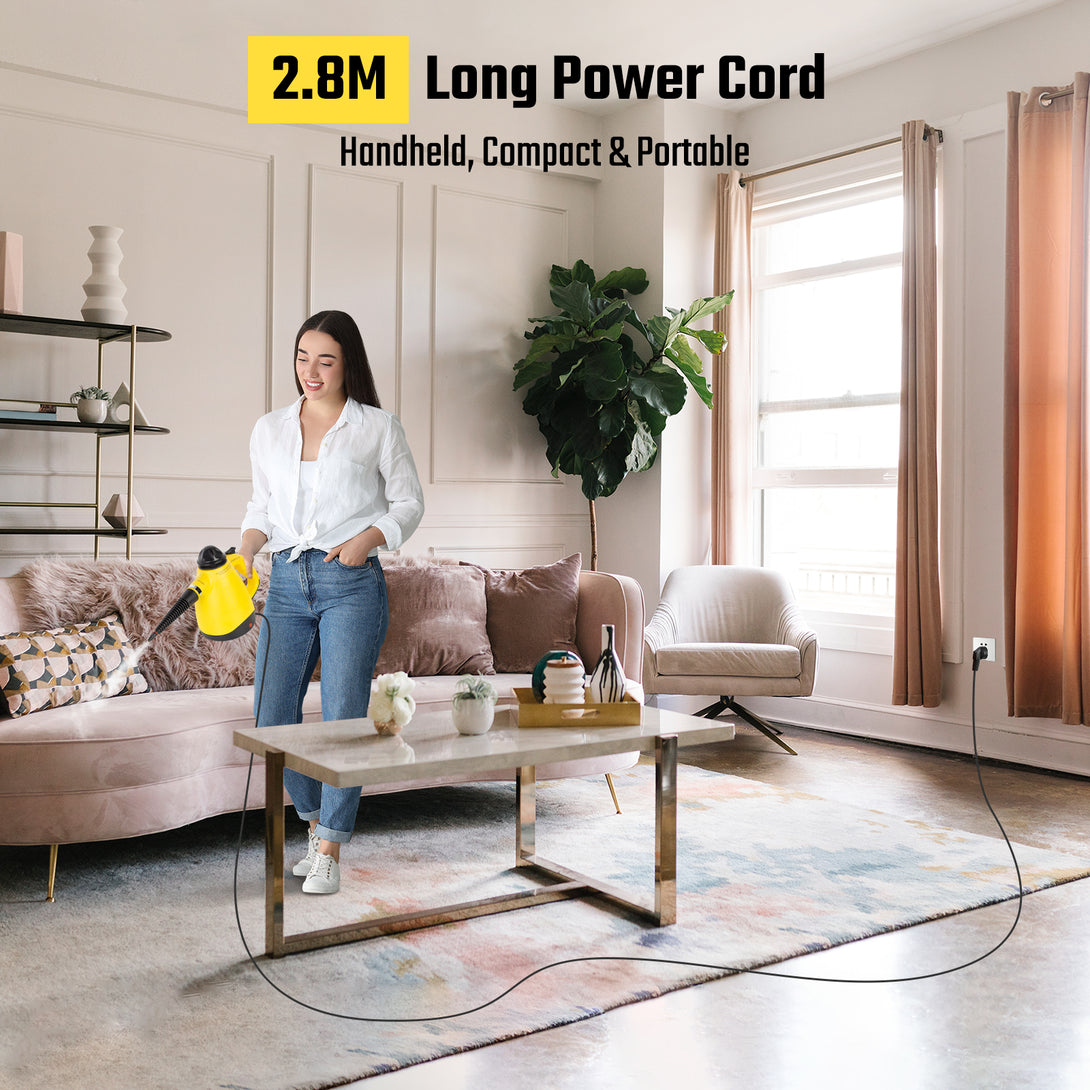 A : Le câble d'alimentation mesure 2,8 mètres de long et le nettoyeur vapeur pèse 1,6 kg.
