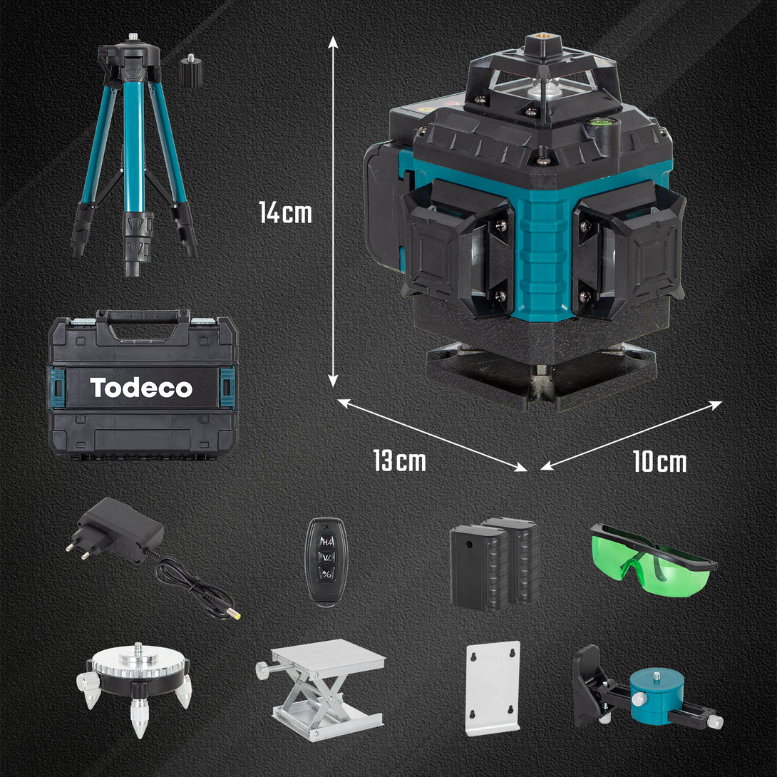 R: Possui nivelamento automático de 360° com planos horizontais e verticais selecionáveis, cobrindo pisos, paredes e tetos com precisão.