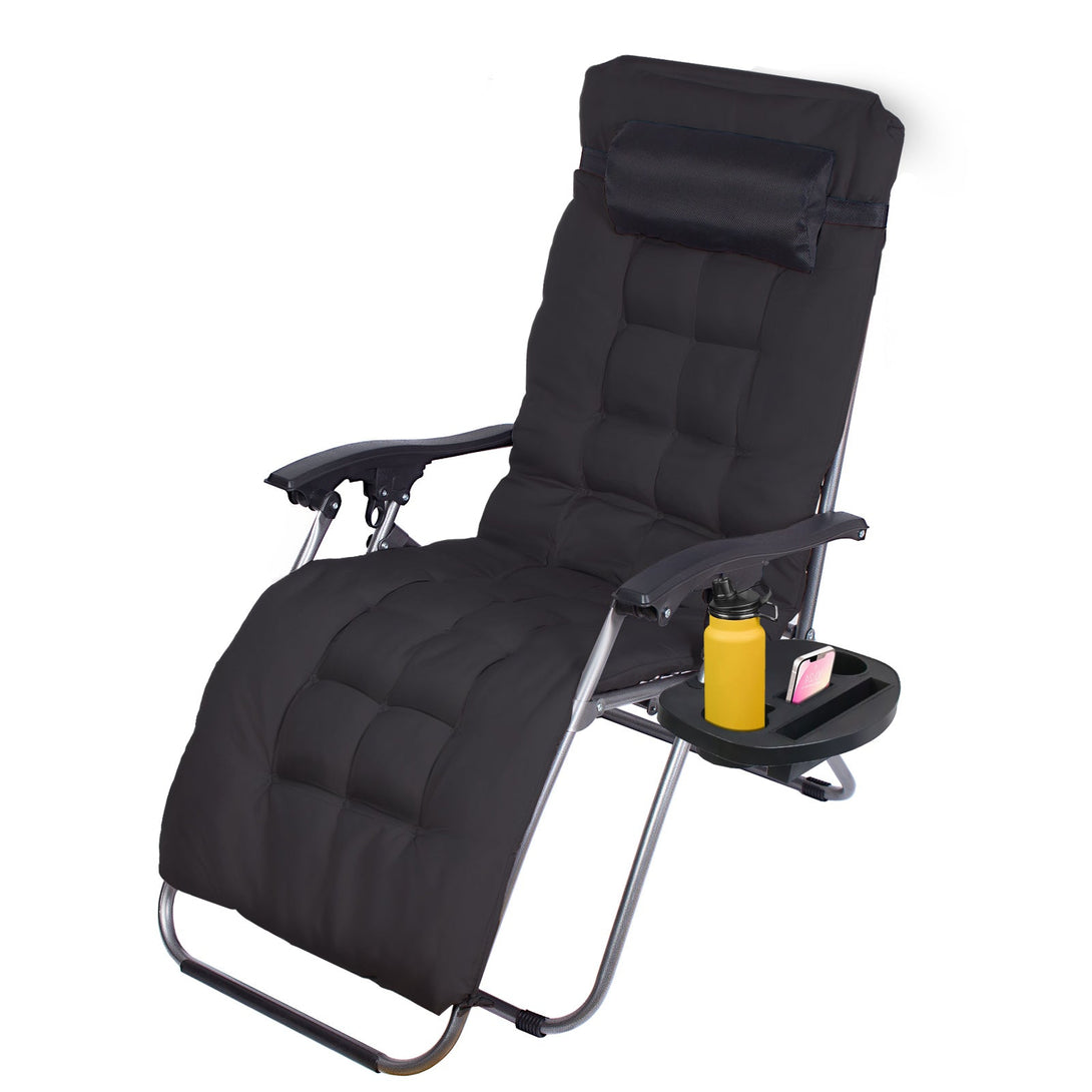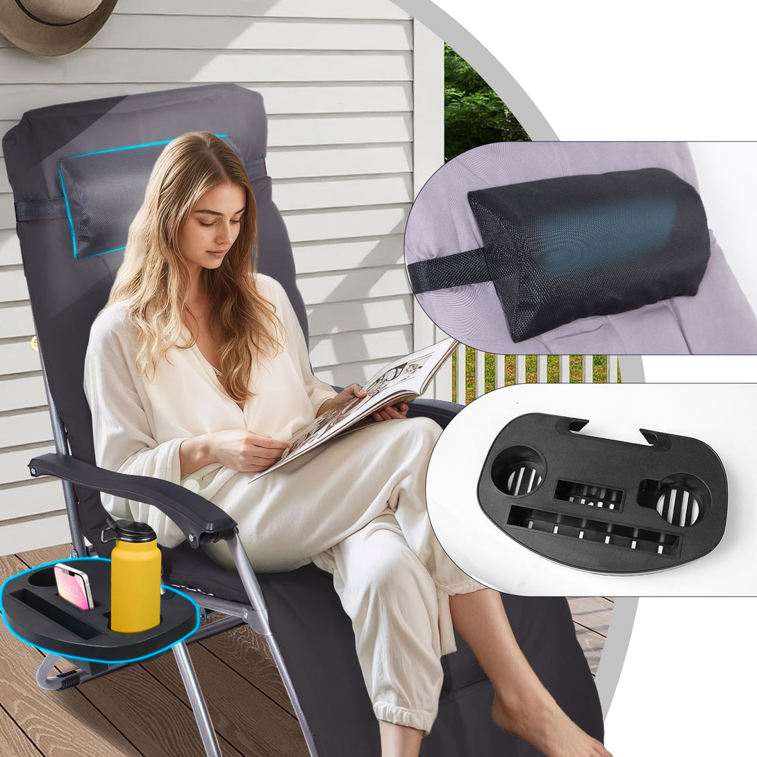R: Inclui almofada removível de 1 kg, travesseiro ergonômico e porta-copos para conforto em atividades como camping, bronzeamento ou relaxamento em casa.