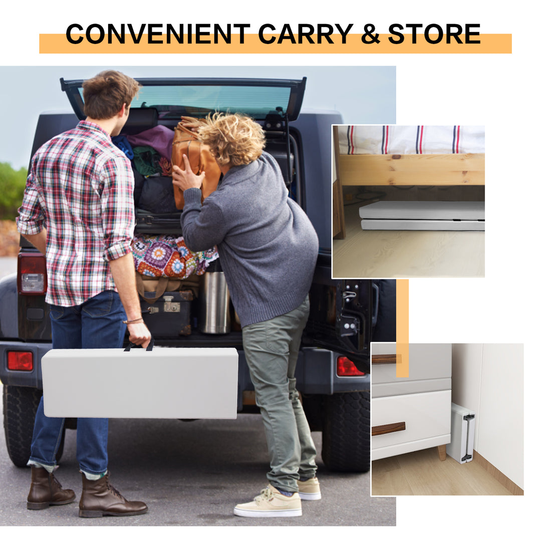 Dobrável: Dobra-se ao meio para facilitar o transporte e armazenamento, ideal para espaços pequenos.